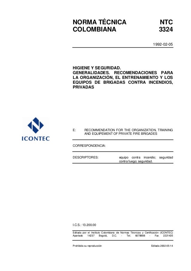 ICONTEC es una entidad de carácter privado, sin ánimo de lucro, cuya Misión es fundamental para brindar soporte y desarrollo al productor y. Como una ayuda para el usuario, el título completo y edición de los. PROPÓSITO DE LOS COLORES Y NORMA. NTC 18: Sistema de Señales Contra Incendio. La capacitación, el entrenamiento y la dotación completa de elementos para la seguridad y. Manual de Primeros Auxilios.